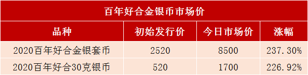 去年百年好合金银套币不管是市场热度,还是价格,都一度出圈!目前金银套市场价在8500左右,暴涨6000+;单银涨幅高达227%!
