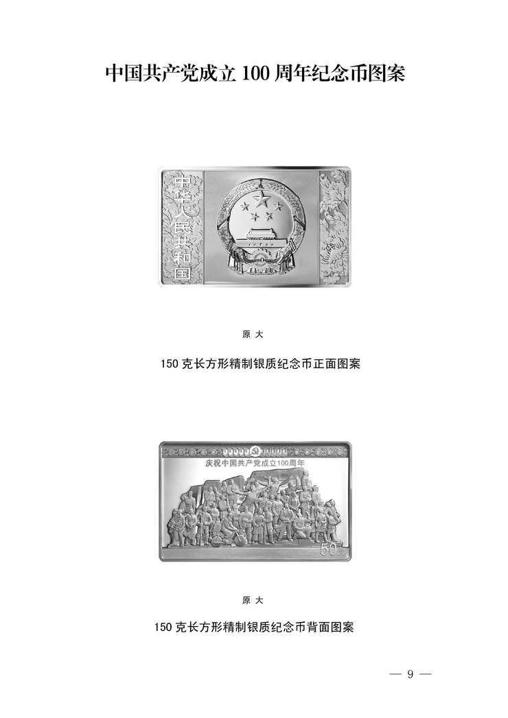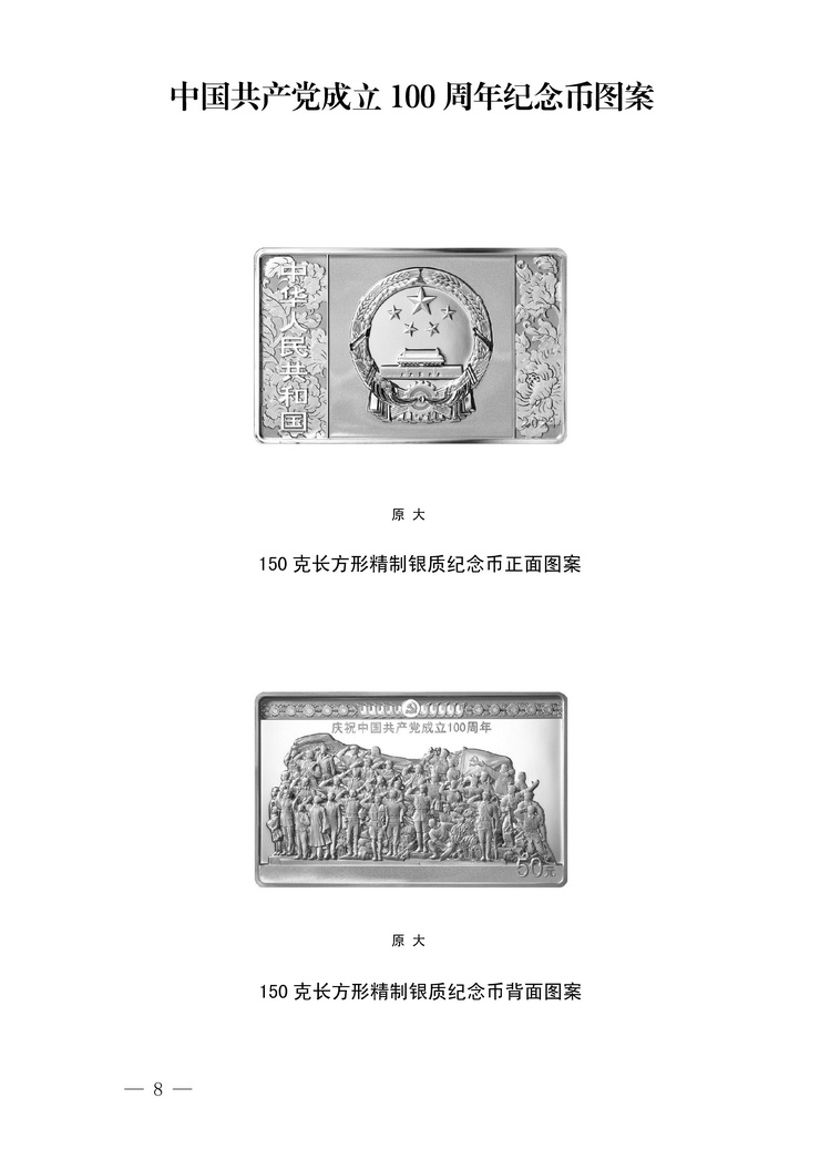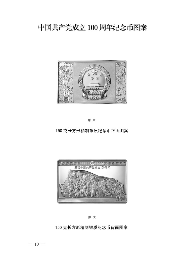 150克长方形银质纪念币背面图案为《攻坚》雕塑局部造型,辅以中国共产党历史展览馆馆徽等组合设计,并刊“庆祝中国共产党成立100周年”字样及面额。