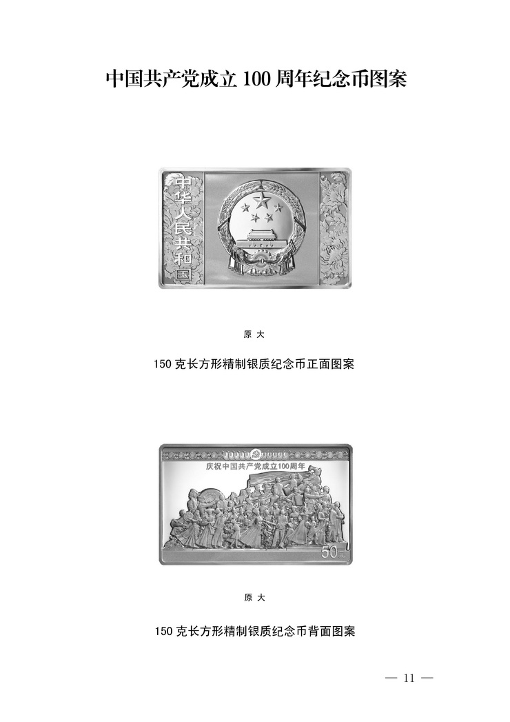 150克长方形银质纪念币背面图案为《伟业》雕塑局部造型,辅以中国共产党历史展览馆馆徽等组合设计,并刊“庆祝中国共产党成立100周年”字样及面额。