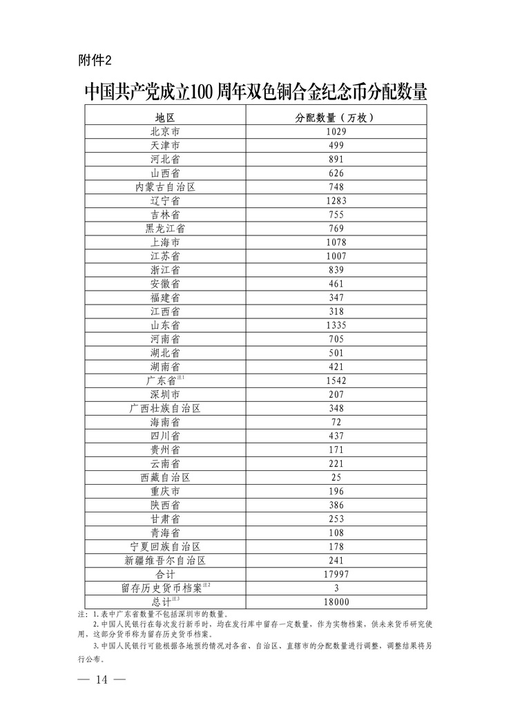 2.中国共产党成立100周年双色铜合金纪念币分配数量