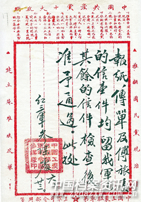 在纪念中国工农红军长征胜利80周年之际,贵州省档案馆向社会公布了一批珍贵的红军档案,其中包括,5件红军邮件查扣条、沿河三等乙级邮局关于红军军事行动和查扣邮件情况的报告等。这些档案翔实、生动地记录了红三军在贵州境内创建黔东根据地、宣传中国共产党政治纲领和红军纪律、组织建立地方苏维埃政权、扩大红军武装等革命活动的史实。