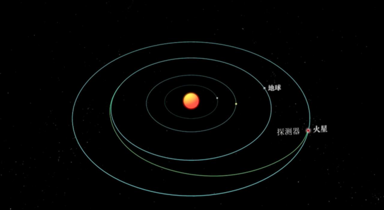 2021年2月10日19时52分,我国首次火星探测任务“天问一号”探测器实施近火捕获制动,环绕器3000牛轨控发动机点火工作约15分钟,探测器顺利进入近火点高度约400千米,周期约10个地球日,倾角约10°的大椭圆环火轨道,成为我国第一颗人造火星卫星,实现“绕、着、巡”目标的第一步,环绕火星成功。