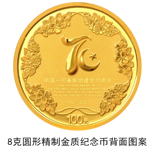 8克圆形金质纪念币背面图案为中国-巴基斯坦建交70周年纪念活动徽标,衬以牡丹花、素馨花等装饰造型组合设计,并刊“中国-巴基斯坦建交70周年”中、英文字样,“1951-2021”字样及面额。