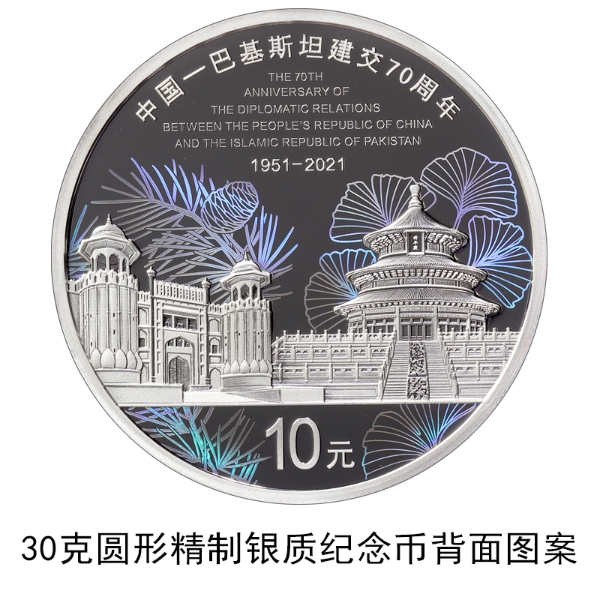 30克圆形银质纪念币背面图案为中国的天坛祈年殿建筑、巴基斯坦的拉合尔古堡建筑,衬以银杏树、喜马拉雅雪松枝叶等装饰造型组合设计,并刊“中国-巴基斯坦建交70周年”中、英文字样,“1951-2021”字样及面额。