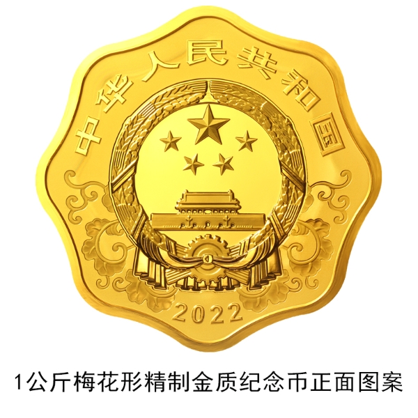 (三)1公斤梅花形金质纪念币为精制币,含纯金1公斤,外接圆直径100毫米,面额10000元,成色99.9%,最大发行量118枚。