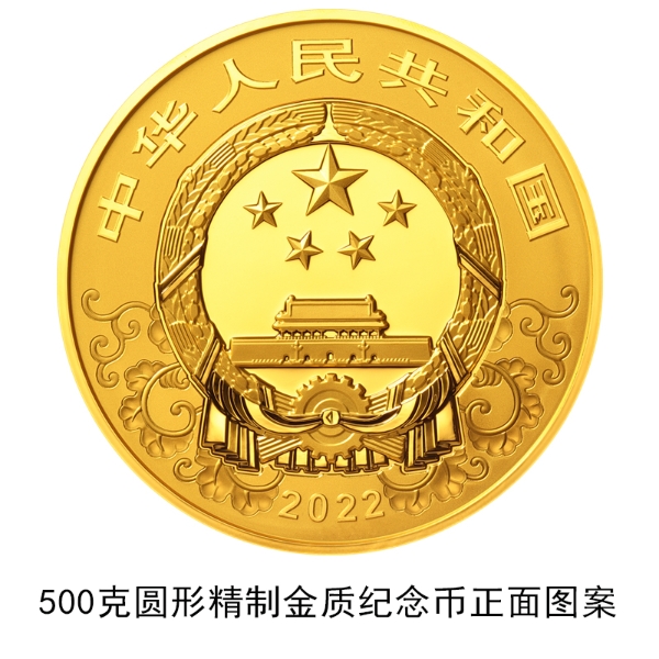 该套金银纪念币正面图案均为中华人民共和国国徽,衬以中国传统吉祥纹饰,并刊国名、年号。