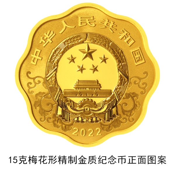 (六)15克梅花形金质纪念币为精制币,含纯金15克,外接圆直径27毫米,面额200元,成色99.9%,最大发行量6000枚。