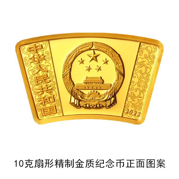 (七)10克扇形金质纪念币为精制币,含纯金10克,外圆半径51毫米,内圆半径36毫米,圆心角30度,面额150元,成色99.9%,最大发行量10000枚。