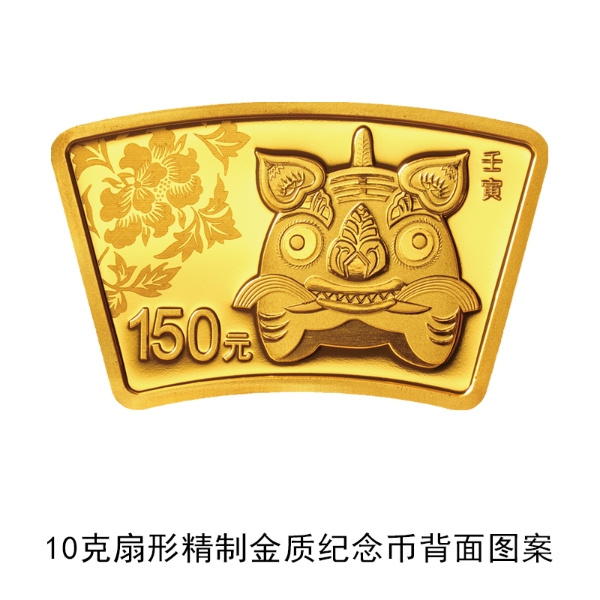 10克扇形金质纪念币背面图案为民俗布老虎造型,衬以吉祥花卉装饰图案。