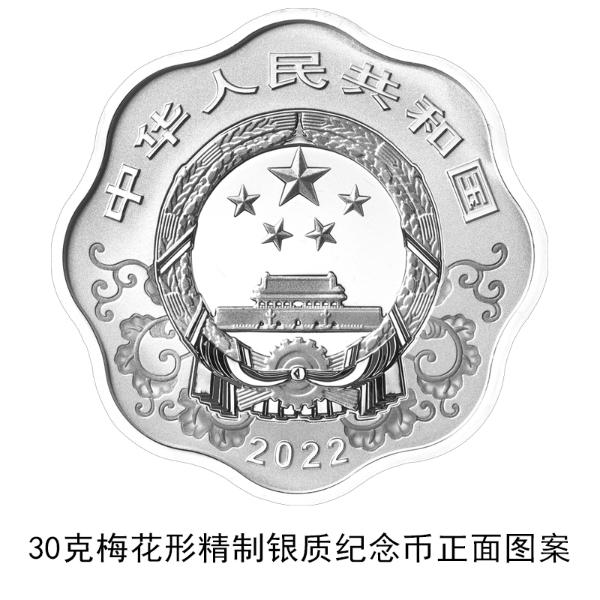 (十一)30克梅花形银质纪念币为精制币,含纯银30克,外接圆直径40毫米,面额10元,成色99.9%,最大发行量50000枚。
