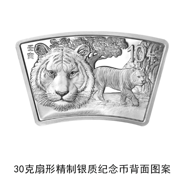 150克长方形金质纪念币和30克扇形银质纪念币背面图案均为行走中的虎与特写虎头造型,衬以树木、山水等设计元素。