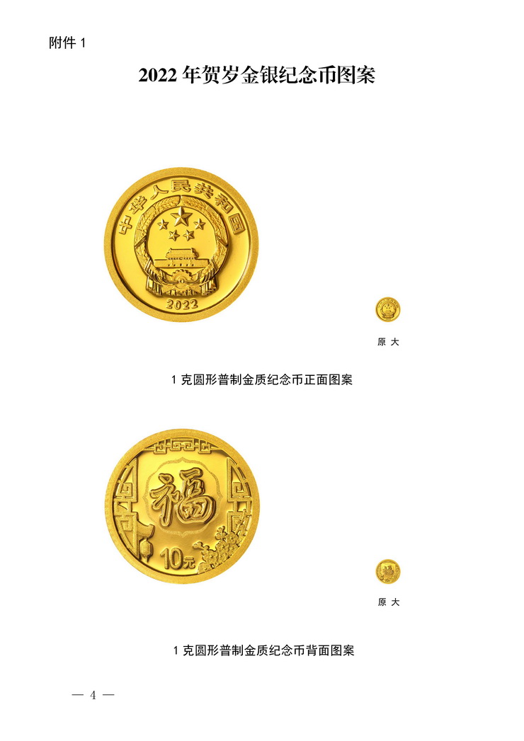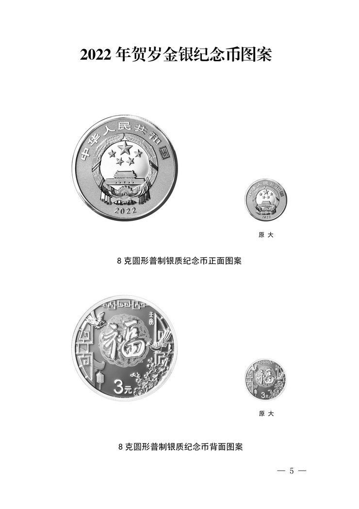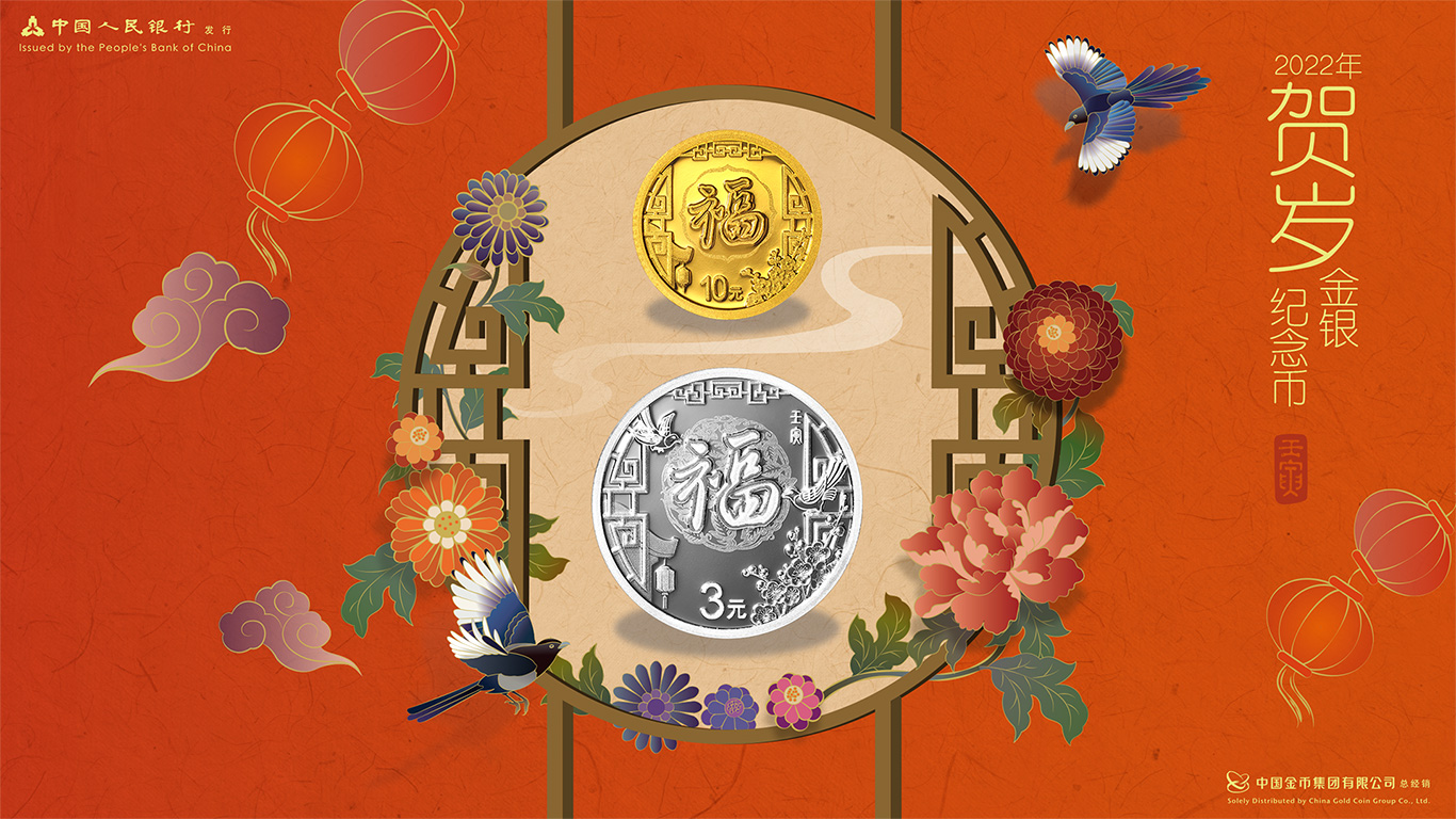为迎接2022中国农历壬寅虎年的到来,中国人民银行定于2021年12月发行2022年贺岁金银纪念币一套。纪念币背面主图案均采用明代文征明的“福”字造型,1克金币配以窗格、梅花、民居房檐等造型组合设计,并刊10元面额;8克银币配以窗格、剪纸团花、喜鹊、梅花、民居房檐等造型组合设计,并刊“壬寅”字样及3元面额。整体画面在展现我国传统民居风格和民间剪纸艺术的同时,喜鹊报春、腊梅盛放等富含春节意蕴的景物的融入,共同衬托出喜庆吉祥的贺岁氛围。