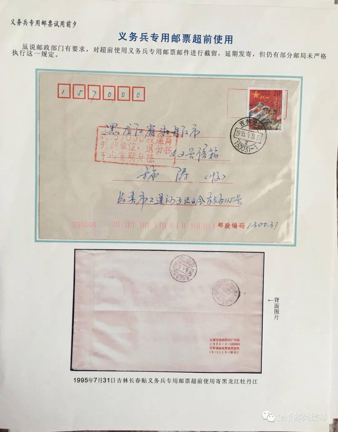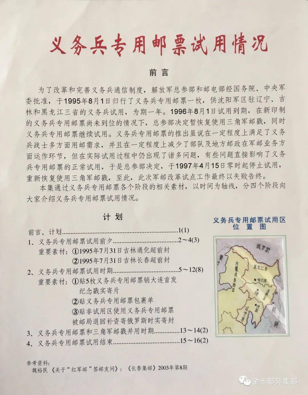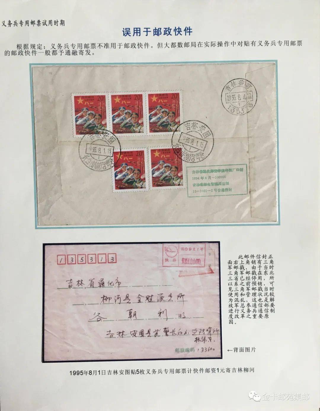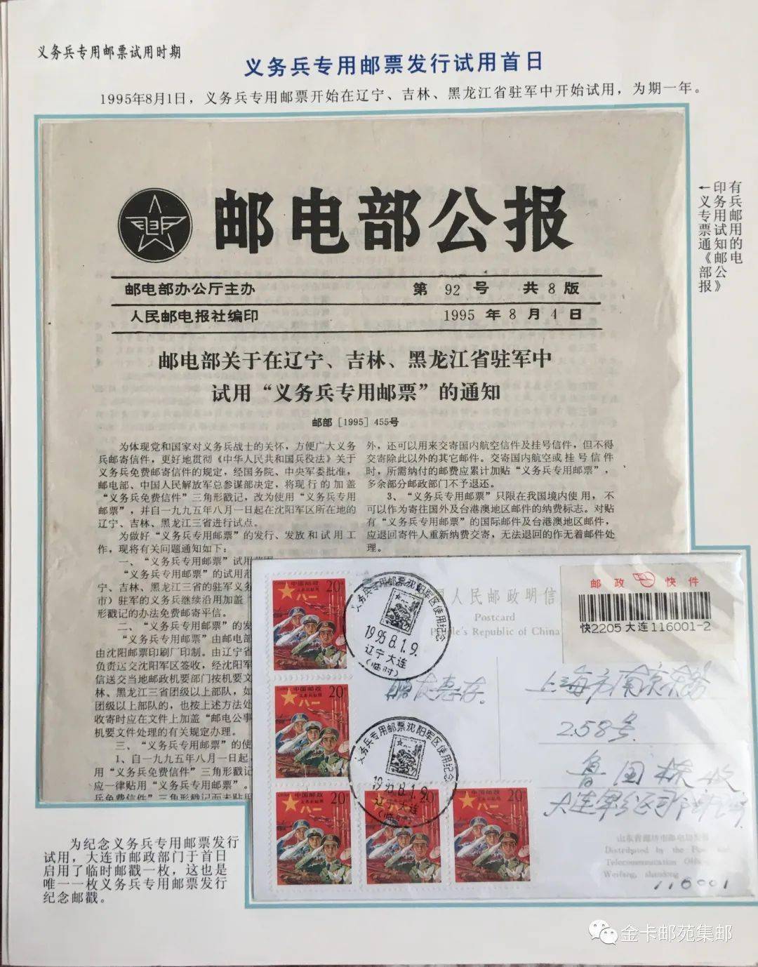 为了改革和完善义务兵通信制度,解放军原总参谋部和邮电部经国务院和中央军委批准,1995年8月1日发行的义务兵专用邮票,集邮界俗称“红军邮”,并在沈阳军区驻东北三省的义务兵试用,为期一年,一年期后继续试用,并于1997年4月15日零时起停止试用。今年恰逢邮票试点发行26周年,今天刊登丁光锐的义务兵“红军邮”1框邮集,该邮集通过“红军邮”义务兵专用邮票各阶段的相关邮政使用素材,分阶段、全方面的展示和介绍“红军邮”义务兵专用邮票试用情况。