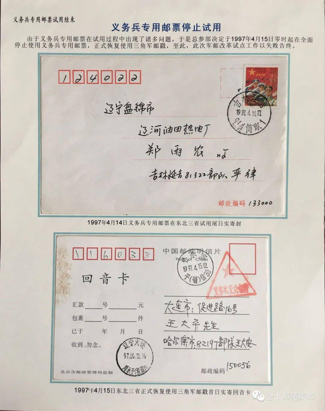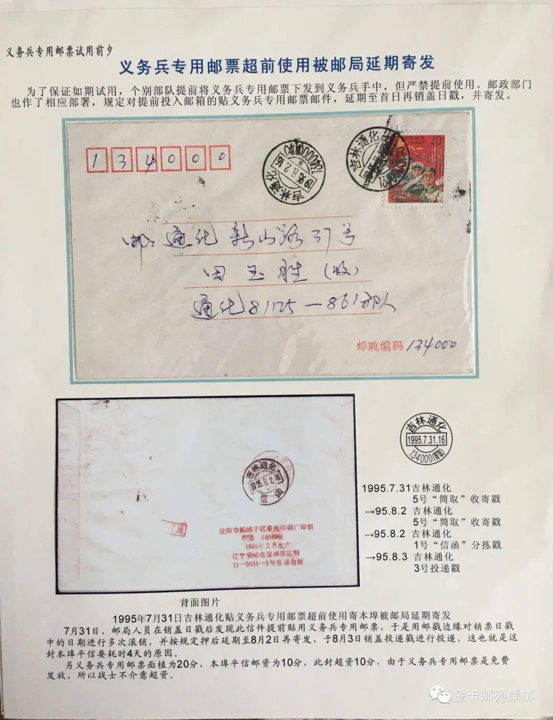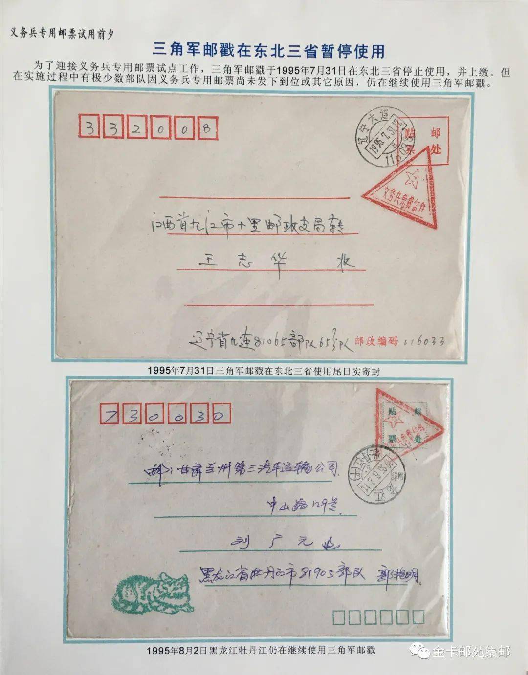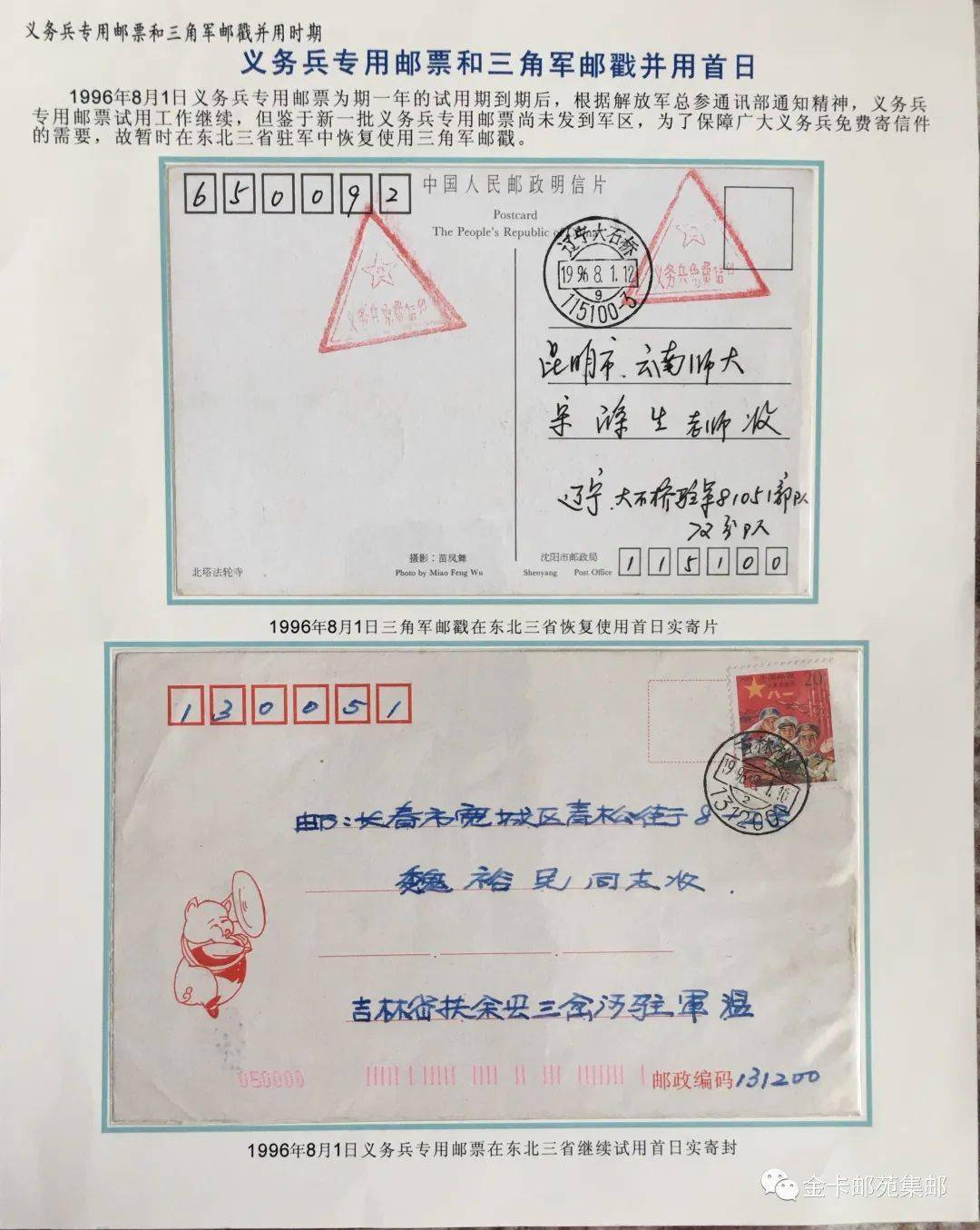 为了改革和完善义务兵通信制度,解放军原总参谋部和邮电部经国务院和中央军委批准,1995年8月1日发行的义务兵专用邮票,集邮界俗称“红军邮”,并在沈阳军区驻东北三省的义务兵试用,为期一年,一年期后继续试用,并于1997年4月15日零时起停止试用。今年恰逢邮票试点发行26周年,今天刊登丁光锐的义务兵“红军邮”1框邮集,该邮集通过“红军邮”义务兵专用邮票各阶段的相关邮政使用素材,分阶段、全方面的展示和介绍“红军邮”义务兵专用邮票试用情况。