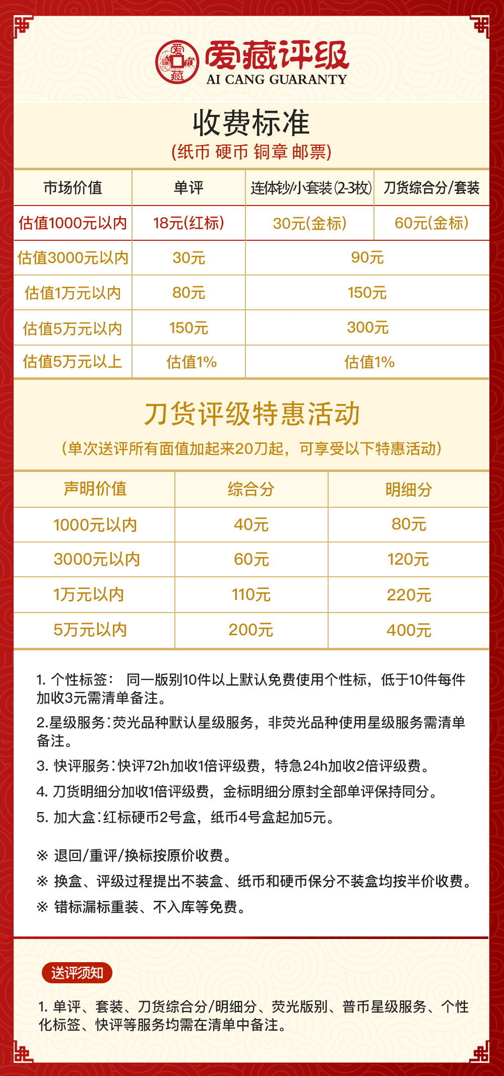从3月1日起,红标单评调整为18元,刀货/大套装:价值一千以内调整为60元、价值三千以内调整为90元。同时刀货评级特惠活动继续进行,单次送评20刀即可享受以下特惠价。