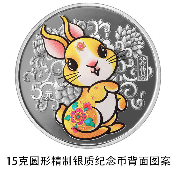 3克圆形金质纪念币及15克圆形银质纪念币背面图案均为装饰兔造型,衬以吉祥纹饰。