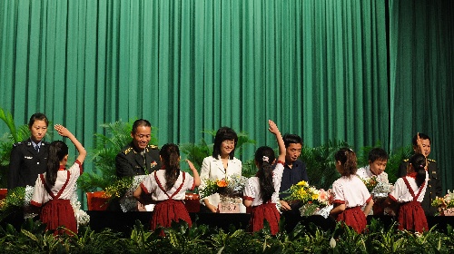 太原,2008年6月20日 抗震救灾英模事迹报告团在山西举行报告会 6月20日,少先队员向6位英模献花。当日,由中共中央宣传部、中共中央组织部、解放军总政治部和四川省委联合组织的抗震救灾英模事迹报告团在太原市南宫举行报告会,龙德强、杨剑、雷楚年、蒋敏、黄金坡和张泉灵分别发言。 新华社记者江宏景摄