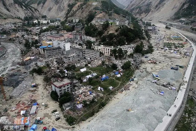 拼版照:上图为2022年5月7日,航拍汶川映秀镇漩口中学地震遗址;下图为2008年5月16日傍晚,汶川县映秀镇漩口中学。“5·12”汶川地震,发生于北京时间2008年5月12日(星期一)14时28分04秒,震中位于四川省阿坝藏族羌族自治州汶川县映秀镇,根据中华人民共和国地震局的数据,此次地震的面波震级里氏震级达8.0Ms、矩震级达8.3Mw,地震烈度达到11度。此次地震的地震波已确认共环绕了地球6圈 。地震波及大半个中国及亚洲多个国家和地区,北至辽宁,东至上海,南至香港、澳门、泰国、越南,西至巴基斯坦均有震感。