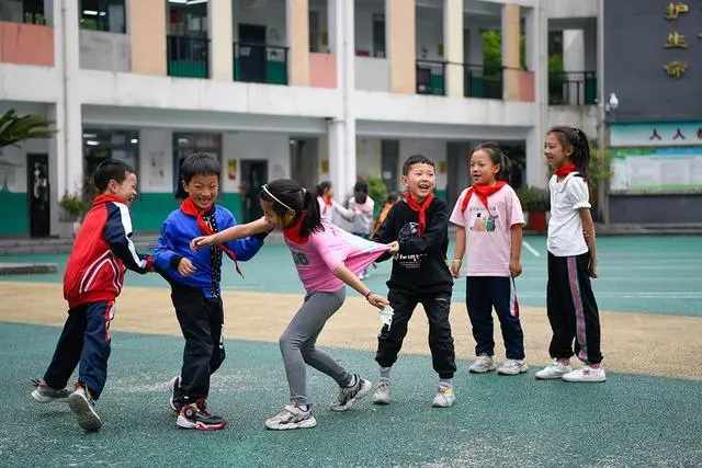 2022年5月12日,在汶川县映秀镇映秀小学,学生们在课间玩耍。