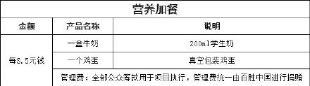 1、营养加餐:每3.5元钱,就可以给欠发达地区的孩子们送去一盒牛奶(200ml学生奶)和1个鸡蛋(真空包装)作为营养加餐,弥补孩子们由于膳食来源单一导致的营养不均衡,针对性的帮助孩子们提升营养摄入;