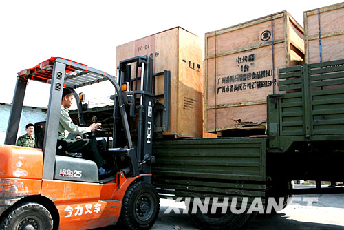 5月13日,解放军总后驻京某综合仓库官兵在装运准备发往四川汶川地震灾区的救灾物资。