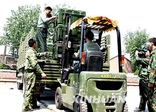 5月13日,解放军总后驻京某综合仓库官兵在装运准备发往四川汶川地震灾区的救灾物资。新华社发(赵建伟摄)