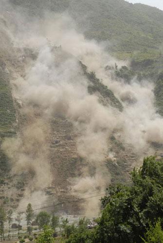 5月12日14点29分:四川广元市青川县梅花山地震引发山体滑坡的场面。邓建新摄