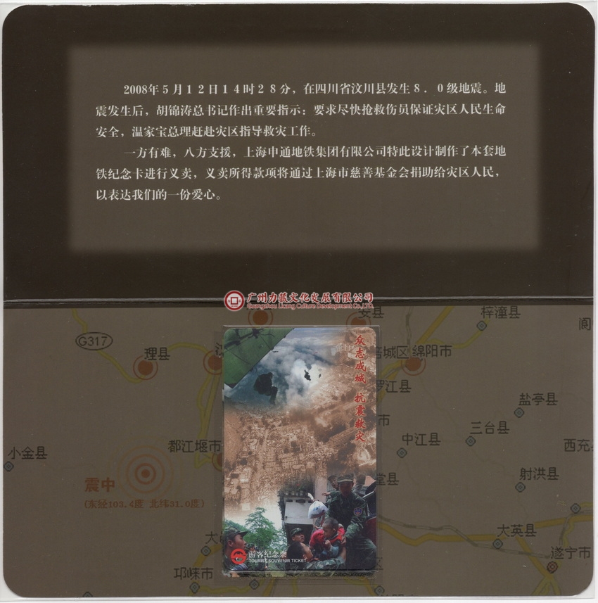 为宣传抗震救灾、弘扬团结互助,根据集团公司相关文件精神,近日票务中心设计制作了一套(2张)单程票,共将印制50万张,号召广大乘客抗震救灾、众志成城、万众一心、重建家园。