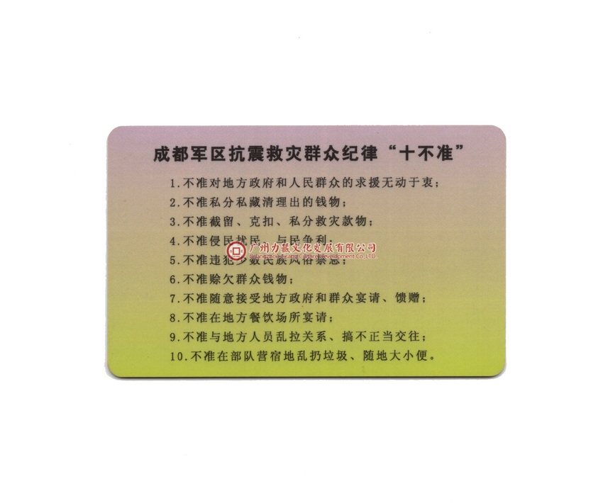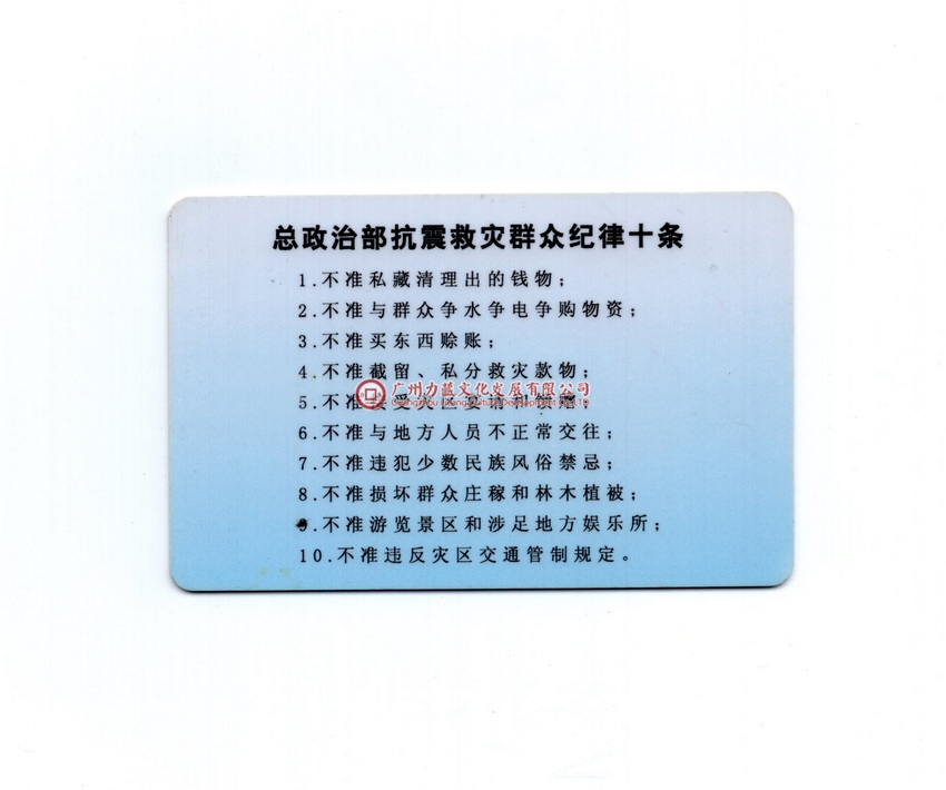 成都军区抗震救灾部队随身携带十不准纪律卡片