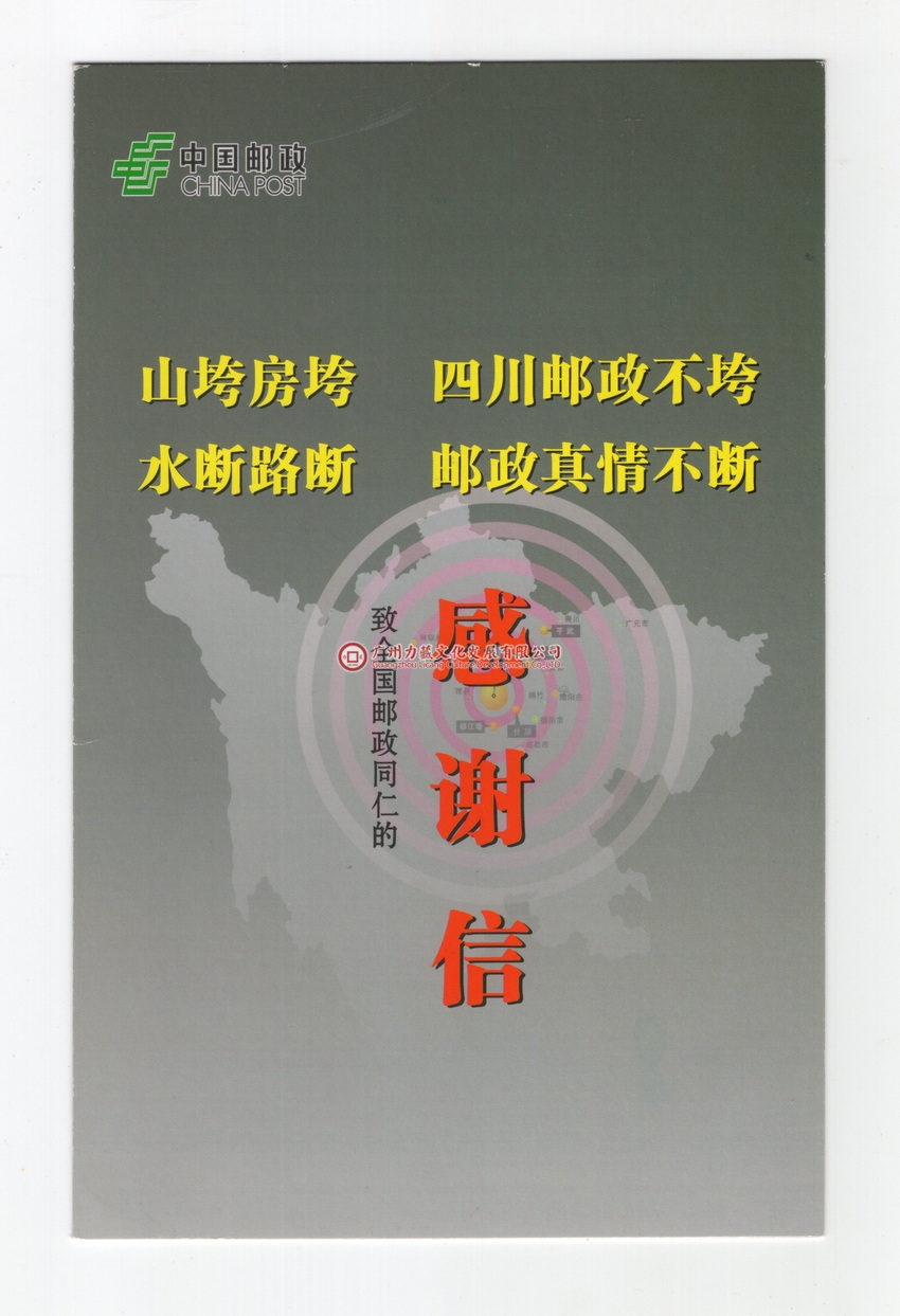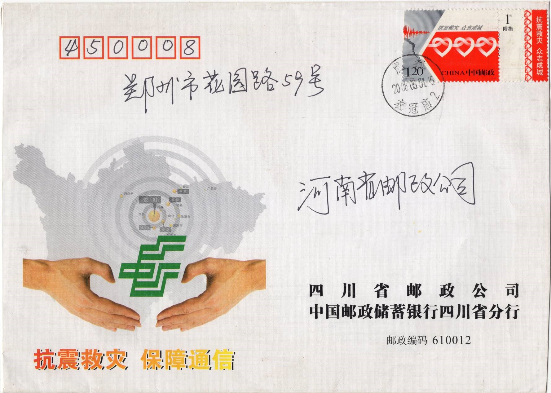 四川成都(2008.5.31)-郑州(6.3)实寄封,内件为寄给各省邮政公司致全国邮政同仁的感谢信