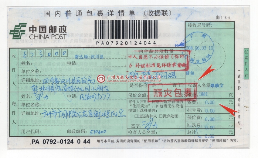 四川汶川地震后,全国邮政系统于5月23日开通免费受理寄往地震灾区的赈灾包裹绿色通道。全国31个省(区、市)群众纷纷通过邮政绿色通道支援灾区。截至6月11日,全国共收寄赈灾包裹54442件、免收费用260.3万元。赈灾包裹主要寄往四川、重庆、陕西和甘肃4个省(市)的重灾区。其中,有51515件赈灾包裹寄达四川省,2109件寄达甘肃省,602件寄达陕西省,216件寄达重庆市。