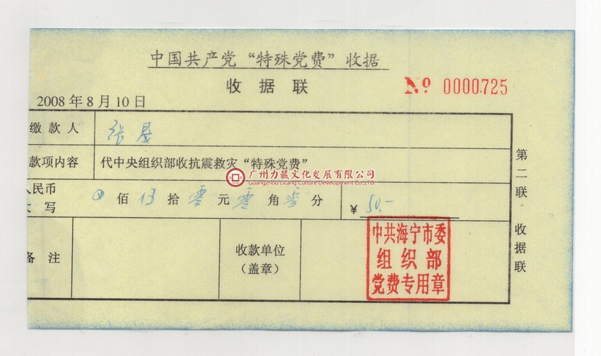 2、交纳用于抗震救灾的“特殊党费”,可通过银行汇至中央组织部党费专用帐户,也可直接送中央组织部。中央组织部党费帐户户名:中共中央组织部,账号:89057668,开户行:工行北京长按支行。同时注明党员姓名、工作单位、联系方式等基本情况、中央中组部收到款项后即向本人出具“中共中央组织部”《党费收据》,交由有关党组织转本人。