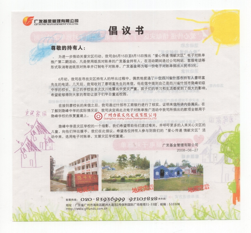 汶川地震发生后,广发公司及公司员工迅速反应,于震灾发生次日紧急向灾区捐款107万元。在了解到地震灾区重建需要之后,公司领导果断做出决策,再次向灾区捐赠100万元,用于都江堰市聚源中学等灾区学校的重建,该笔捐款已于5月16日上午划至中国红十字总会。