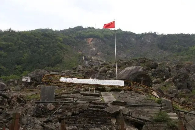 北川老县城景家山崩塌遗址。地震来临时,北川中学新区(原曲山镇茅坝初中)等单位房屋瞬间倾倒或被山上200万方倾泻而下的土石整体掩埋,造成大量人员伤亡。