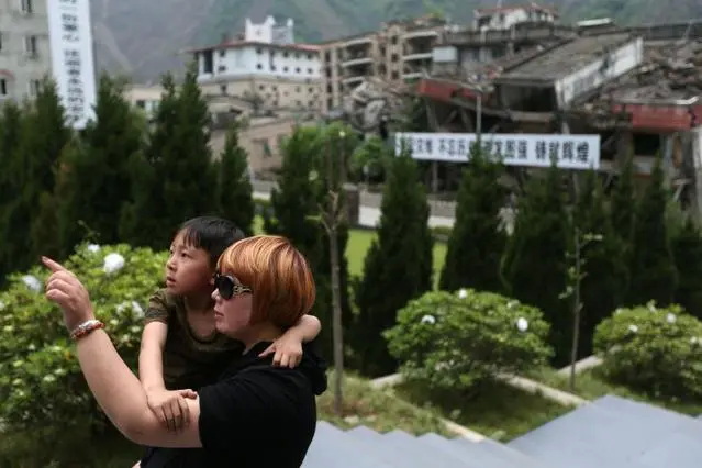 一位母亲正在北川老县城遗址向孩子讲解5.12大地震这突如其来的灾难造成的破坏。