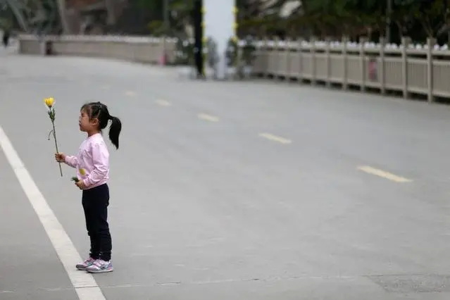 一个孩子向北川中学新区被山崩掩埋的遗址献花。