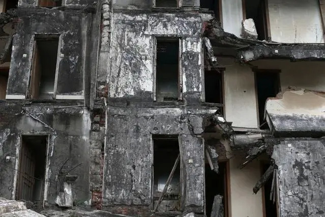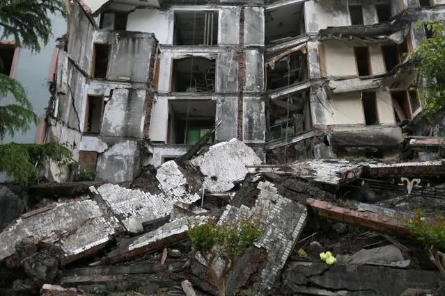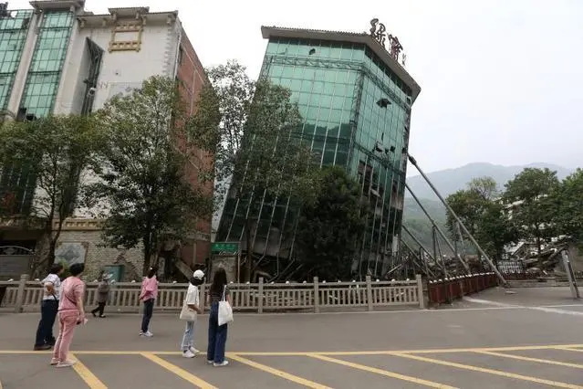 北川老县城的绿宝宾馆大楼在地震来临时被撕裂倾倒。
