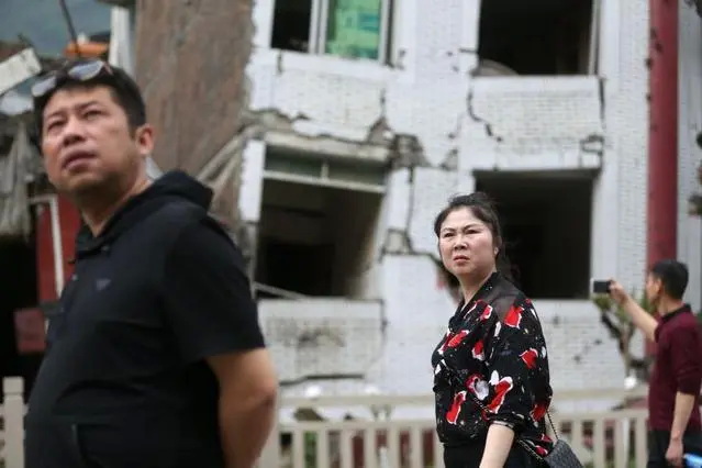 人们在北川老县城遗址看到大地震留下的残垣断壁,表情复杂。