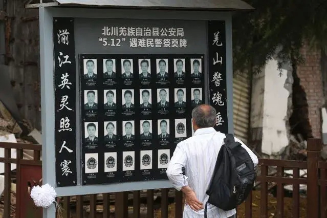 一名参观者伫立在北川县公安局遗址前的遇难民警祭奠牌前久久没有离去。大地震造成公安人员重大伤亡,但幸存的民警在第一时间对周边群众展开了救援。