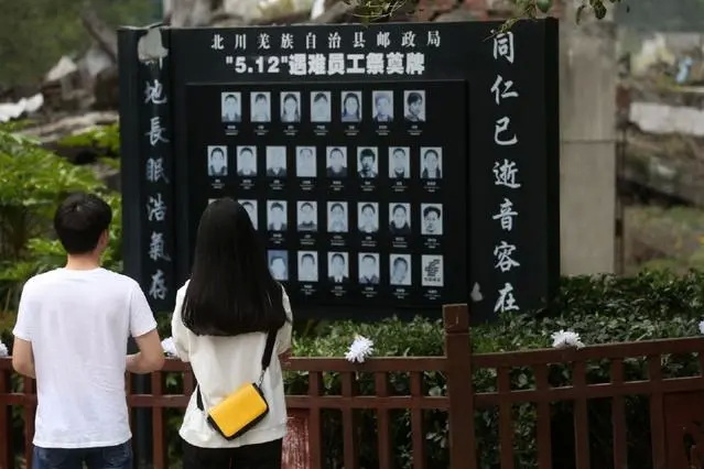 两名参观者正在观看北川县邮政局遇难员工祭奠牌。