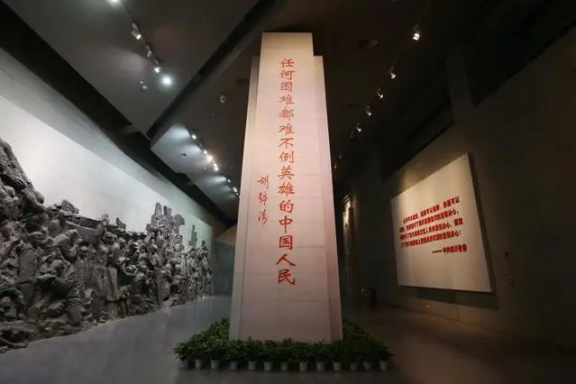 时任国家主席胡锦涛在地震废墟上喊出的:“任何困难都难不倒英雄的中国人民!”被刻在了北川地震纪念馆进门处的石碑上。