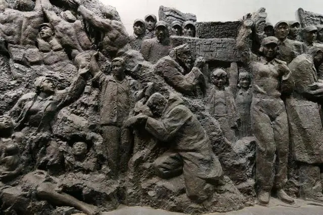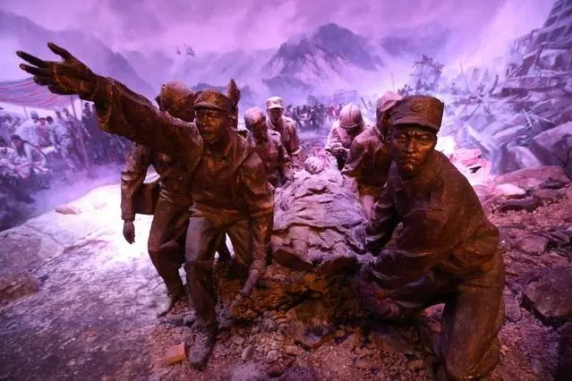 北川地震纪念馆中展示的解放军官兵救援形象的雕塑。