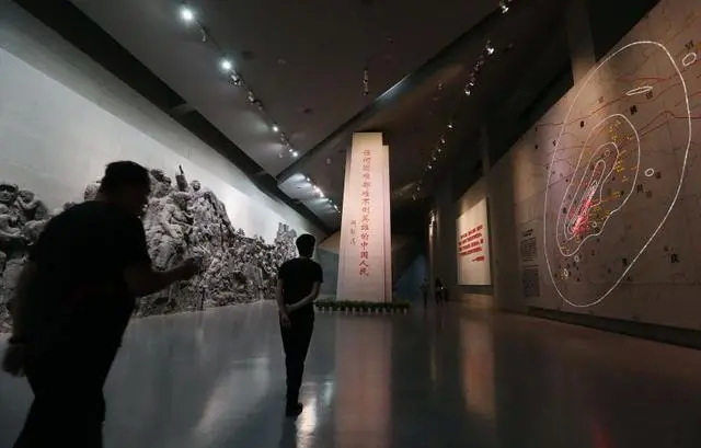 北川地震纪念馆。正中央是刻有时任国家主席胡锦涛在地震废墟上讲话的石碑,左侧为“山川永纪”雕塑,右侧是5.12特大地震震区及地震强度示意图。