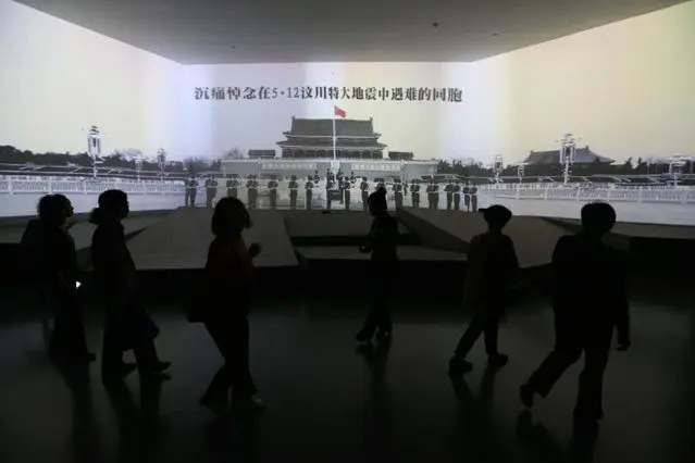 参观者正在北川地震纪念馆观看5.12特大地震的视频资料。