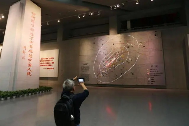 一位参观者正在北川地震纪念馆拍摄5.12地震示意图。