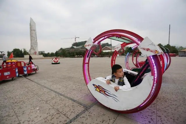 一个孩子正在北川新县城“新生广场”的游乐设施中玩耍。