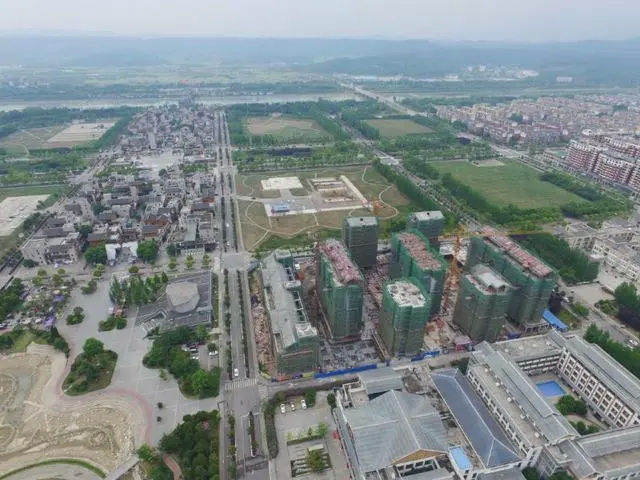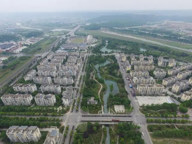 北川新县城航拍图。新县城所在地被命名为永昌镇,寓意北川永远昌盛。距离老县城23公里,紧邻安昌河,依山傍水,自然条件优越。城市道路有以老北川各乡镇名称命名的,如陈家坝路、擂鼓路等;也有的沿用老县城的街名,如文武街、禹羌路等;核心区街道多以“西羌”、“禹王”命名,以彰显羌族特色。