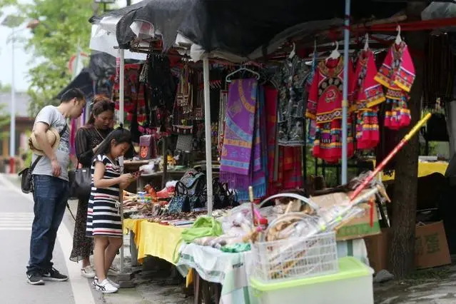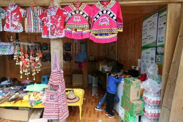 一家三口在吉娜羌寨挑选旅游纪念品。