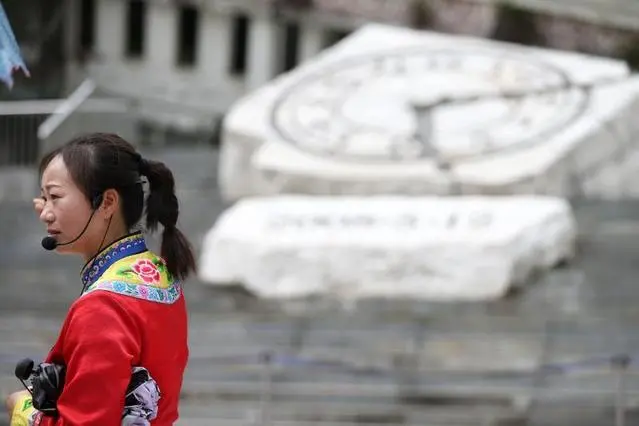 一名映秀镇本地导游身穿羌族服装,在漩口中学遗址为游客进行讲解。