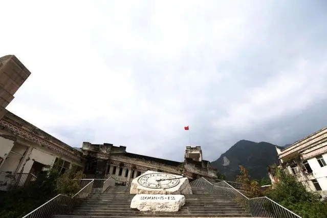 漩口中学遗址前的钟表造型雕塑取材于坍塌教室里找到的一只挂钟,时间被定格在2:28分。后面的主教学楼原本为五层建筑,地震发生时,1、2层沉降于地下,地面三层倾倒,仍有部分师生遗体长眠于地下部分。